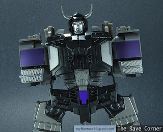The G1-esque design collaborated color injected plastic and layers of painted details very tastefully. Most of Motormaster's body is dark flat silver. His back, head (mostly), chest, biceps, elbows, thighs, and feet are black. The robot also sports purple panels, blue face, and a Decepticon insignia on his chest.